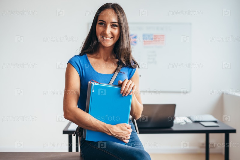 Студентка, сидящая за столом, улыбается и смотрит в камеру