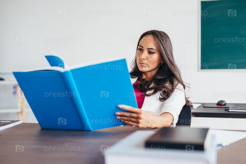 Молодая женщина сидит за столом и читает книгу