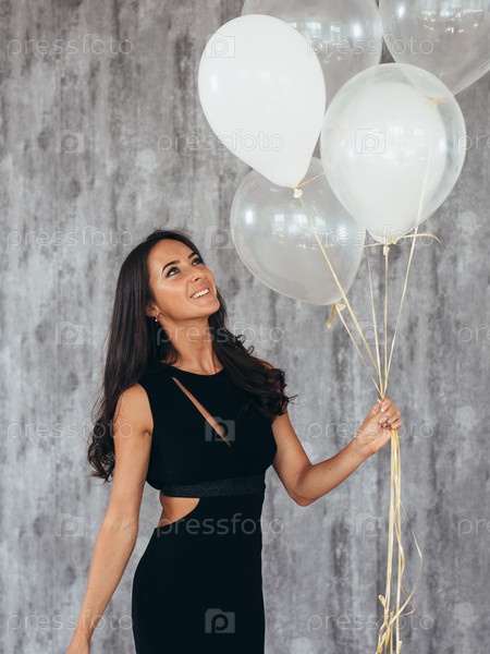 Веселая молодая женщина с воздушными шарами стоит и улыбается
