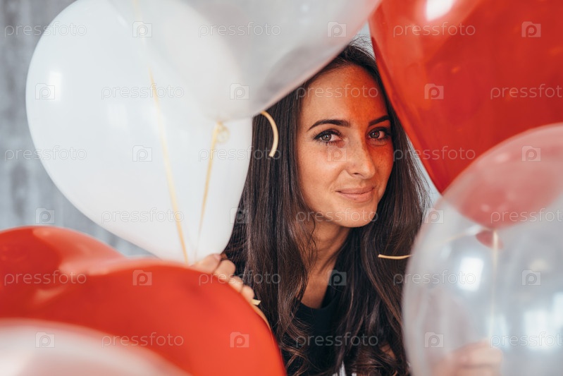 Веселая молодая женщина с воздушными шарами стоит и улыбается