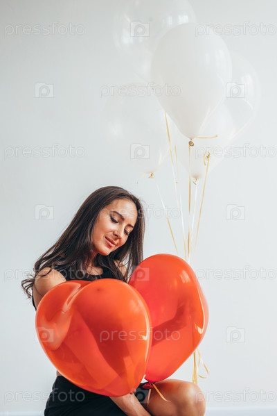 Веселая молодая женщина с воздушными шарами стоит и улыбается