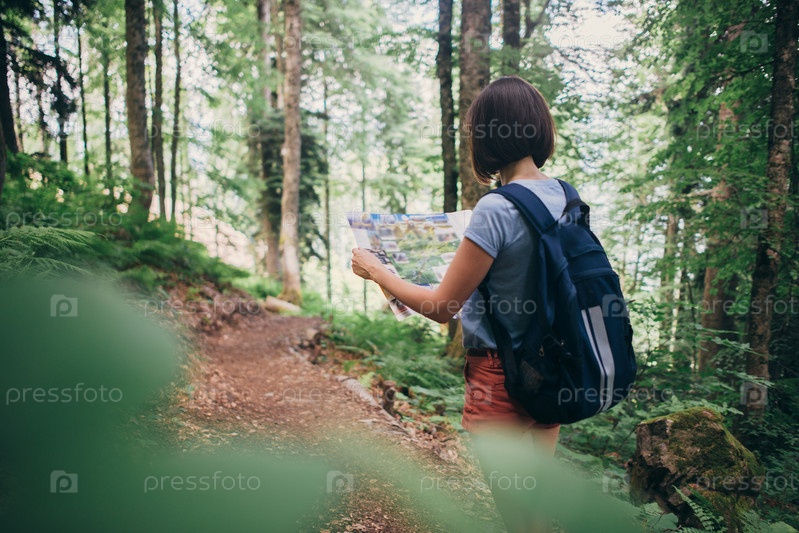 Женщина смотрит на карту во время прогулки по лесу
