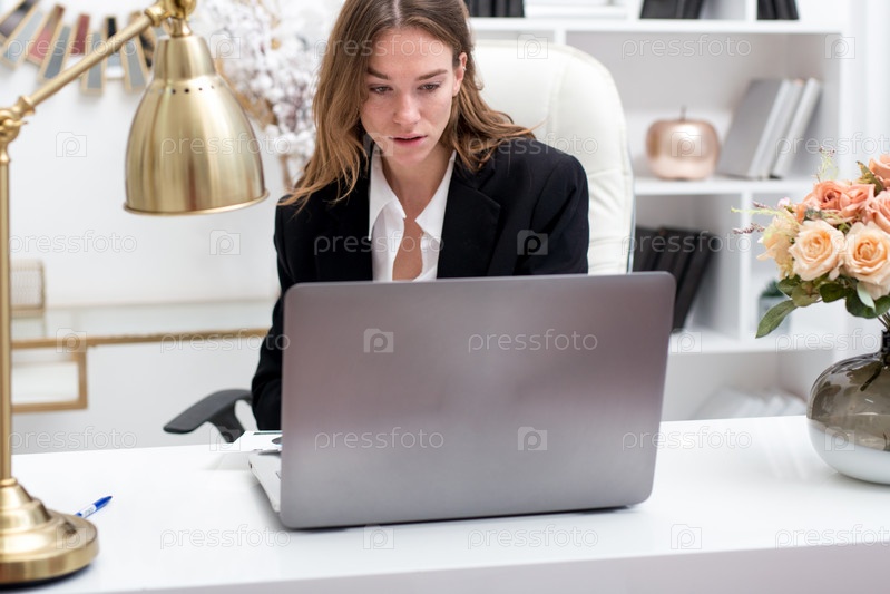 Молодая женщина, работающая с ноутбуком за своим столом в офисе