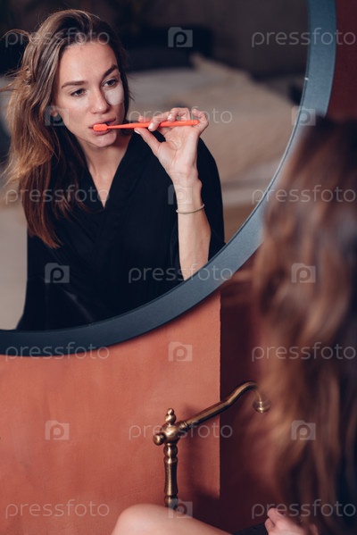 Молодая женщина чистит зубы перед зеркалом