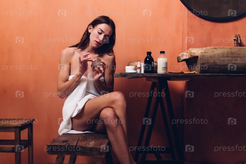 Молодая женщина в полотенце с косметикой