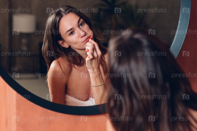 Молодая женщина чистит зубы перед зеркалом