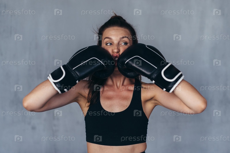 Молодая женщина-боксер в шутку бьет себя