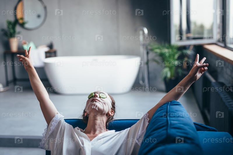 Женщина лежит на диване с тканевой маской на лице и ломтиками огурца