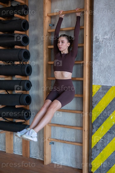 Подтянутая женщина висит на шведской стенке и поднимает ноги