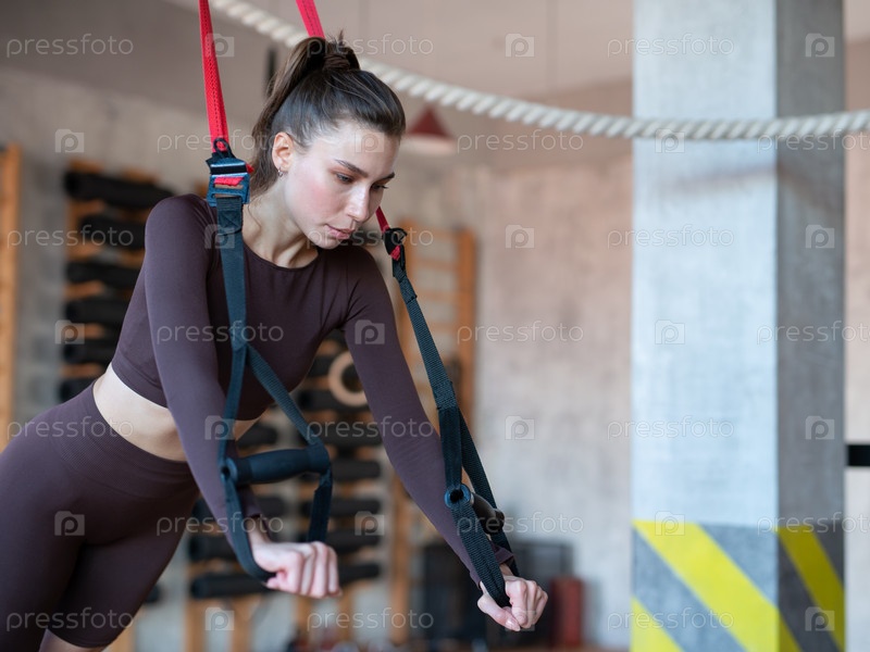 Подтянутая женщина делает отжимания с trx