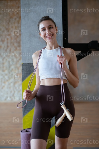 Портрет подтянутой женщины со скакалкой, готовой к тренировкам