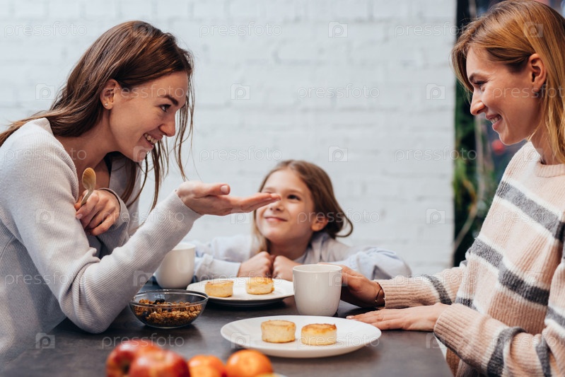Две молодые женщины разговаривают во время еды и ребенок за столом рядом с ними