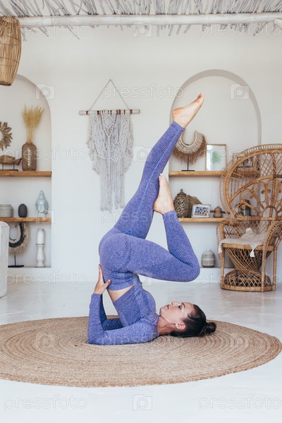 Женщина, практикующая дома, делает стойку на плечах с поднятыми ногами