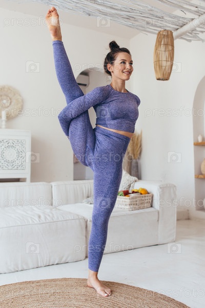 Молодая женщина работает дома. Поза Райской Птицы Сварга Двиджасана