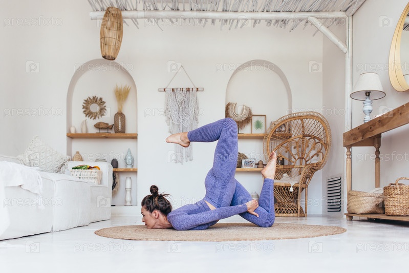 Молодая женщина тренируется дома, занимаясь продвинутой йогой
