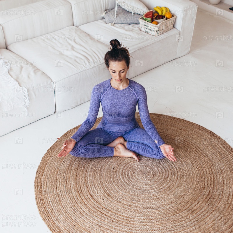 Молодая женщина занимается йогой в гостиной, расслабляется с медитацией йоги дома