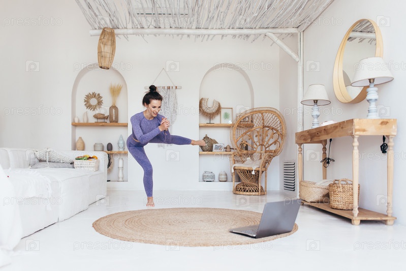 Девушка делает приседания на одной ноге во время тренировки дома