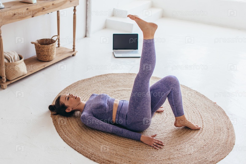 Подходящая женщина тренируется дома и делает упражнения на ягодичный мостик