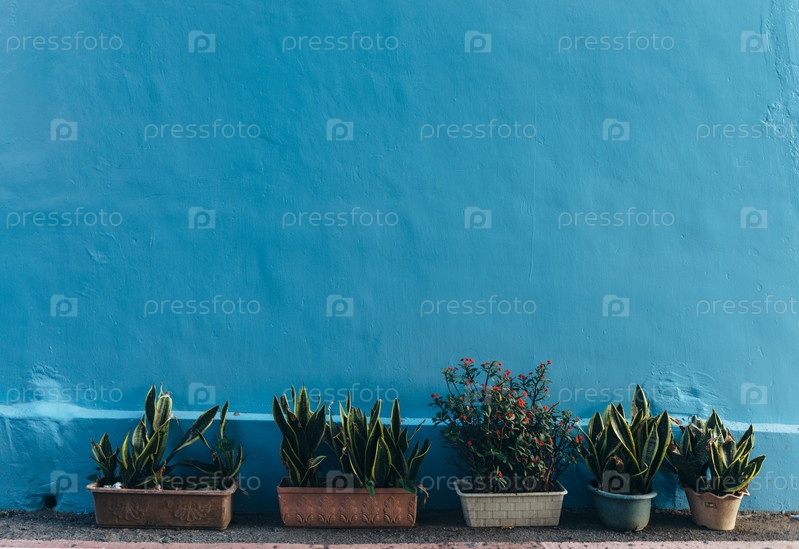 Голубая стена с цветами в горшках. Фон