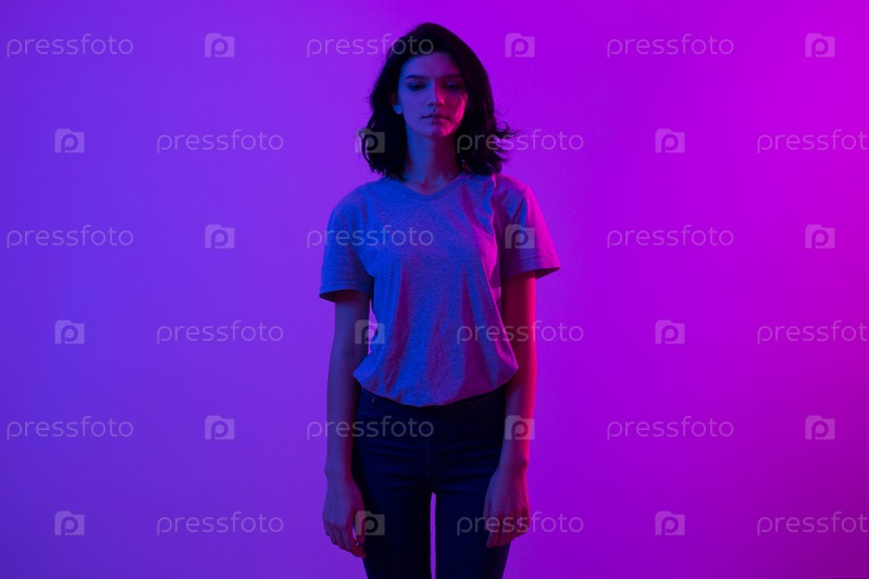 Молодая женщина в розово-голубых неоновых огнях. Творческий красочный портрет