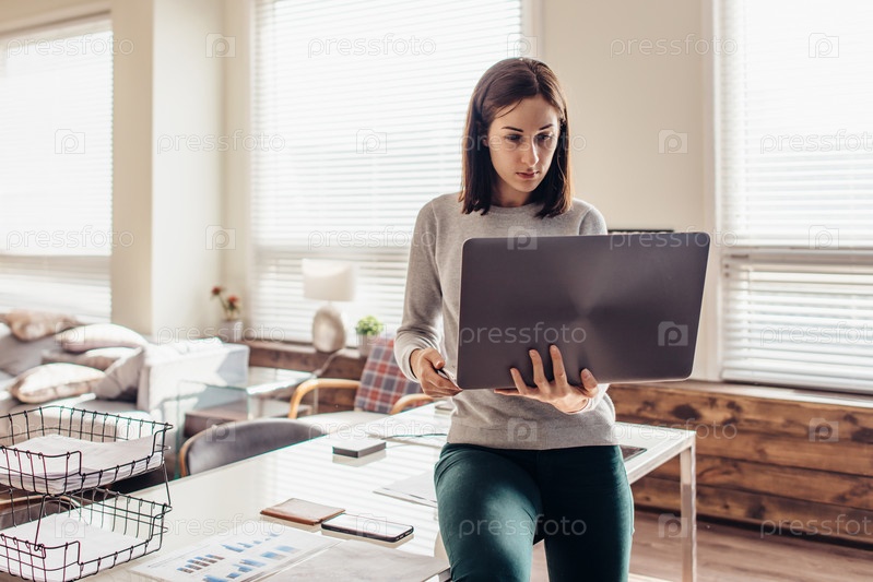 Женщина сидит на рабочем столе с ноутбуком в руке
