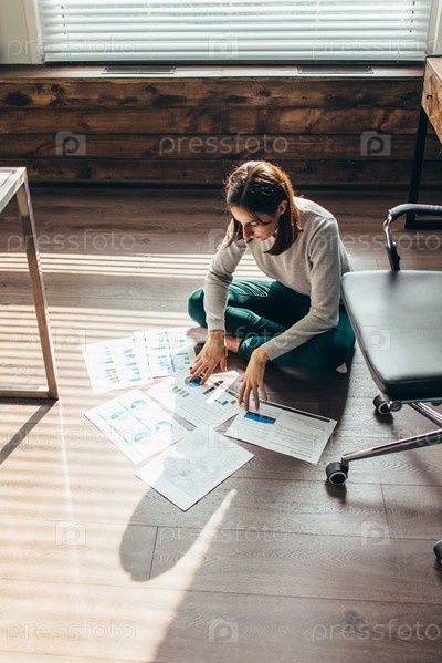 Женщина работает сидя на полу с официальными документами. Самоизоляция и работа дома