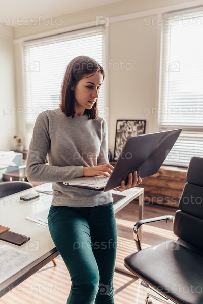 Женщина стоит возле рабочего стола с ноутбуком в руке