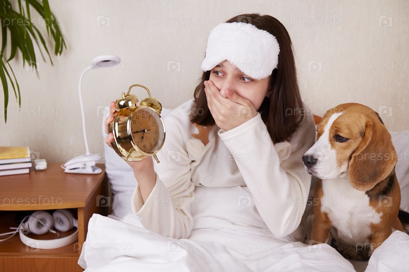 Милая девочка-подросток со своим псом-биглем лежит в постели под одеялом