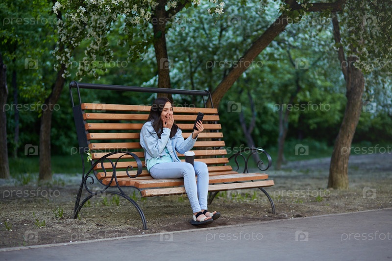 Молодая девушка делает селфи на свой телефон, сидя на скамейке в городском парке. Весна