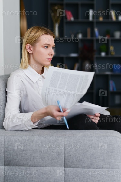 Женщина сидит в офисе с бумагами