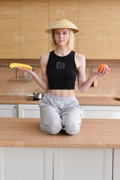 Женщина медитирует на кухне с тарелкой на голове