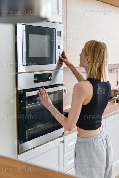 Женщина разогревает еду в микроволновке