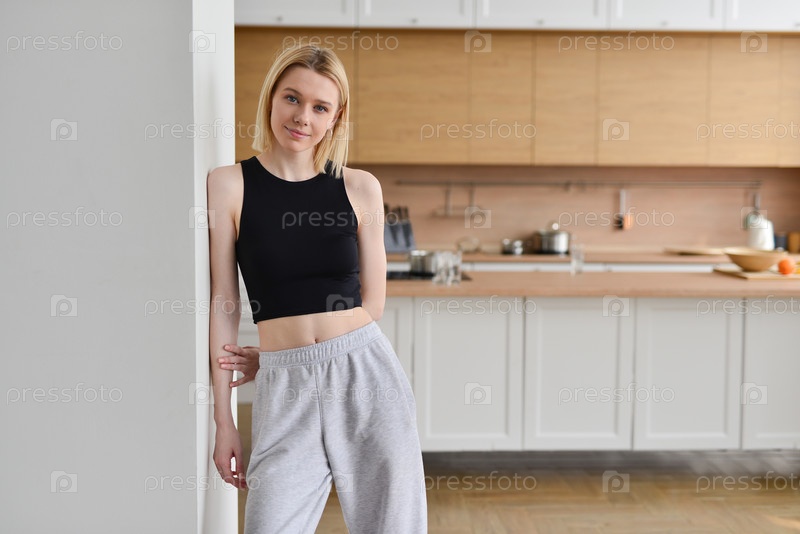 Спортивная женщина, стоящая дома на кухне
