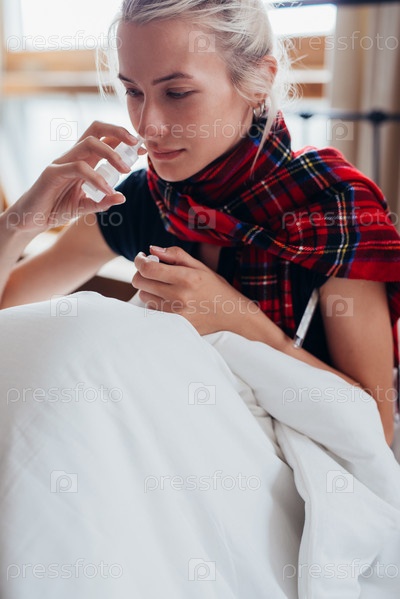 Молодая женщина больна в постели, распыляя лекарство в нос
