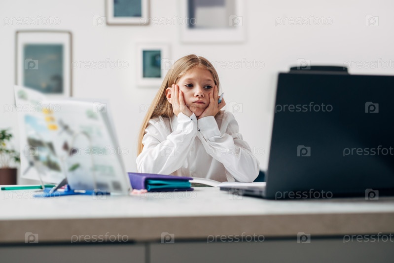 Девушка смотрит на экран своего ноутбука, делая домашнее задание