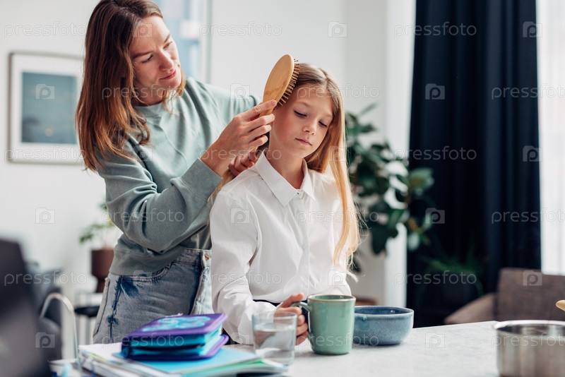 Школьница завтракает дома, пока ее мать расчесывает волосы