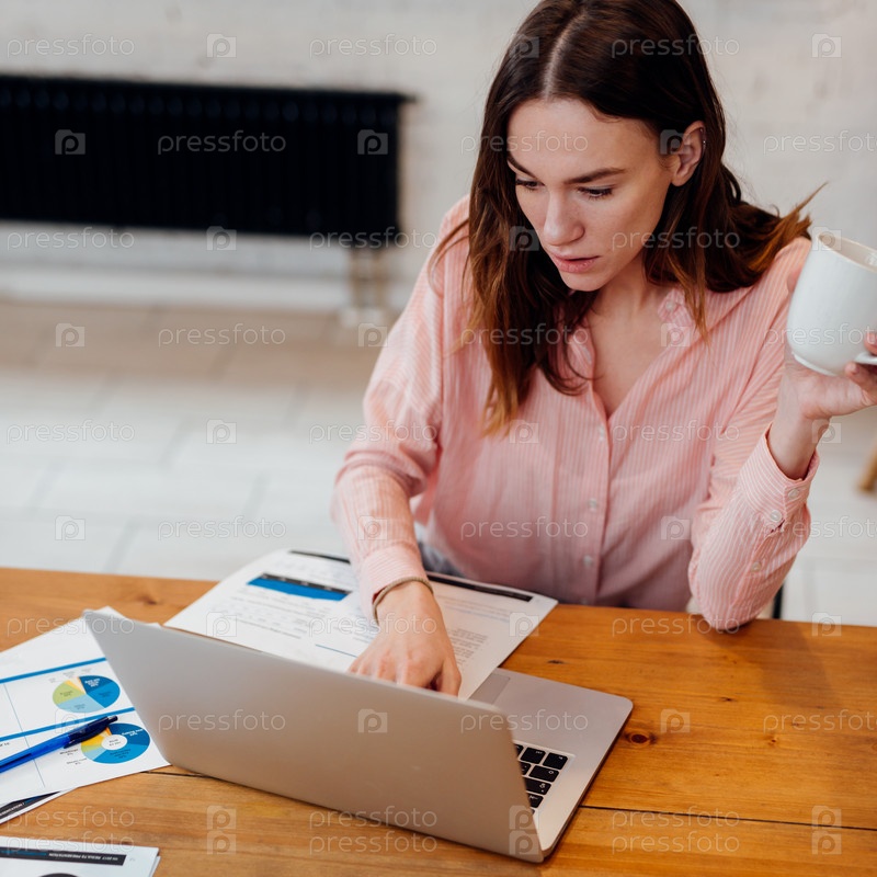 Молодая женщина сидит с кружкой за ноутбуком во время рабочего перерыва