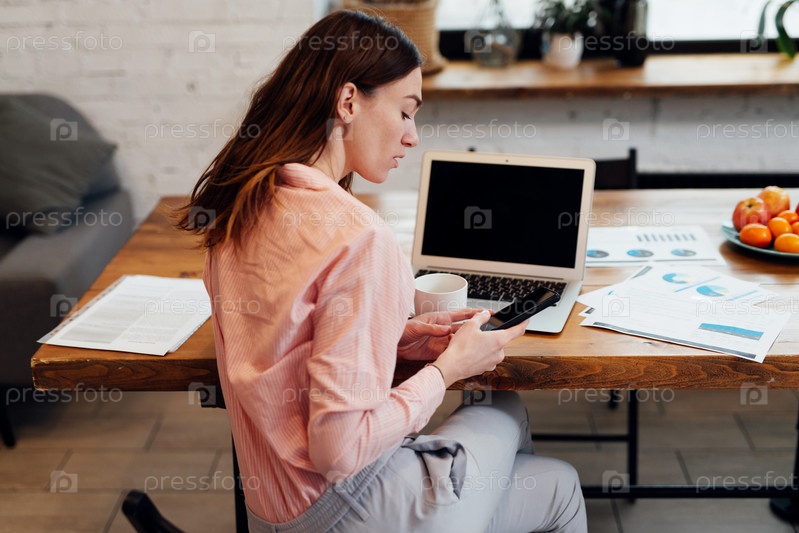 Молодая женщина сидит за своим столом со смартфоном
