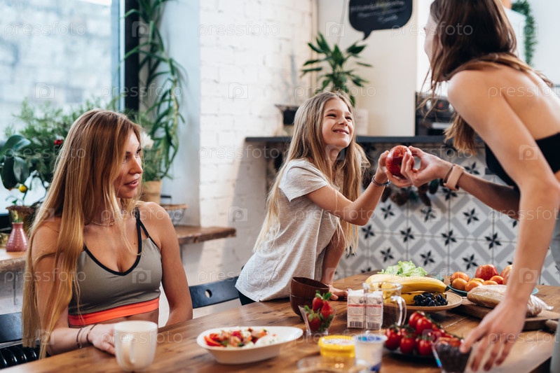 Молодая женщина угощает своих друзей фруктами после легкой тренировки дома