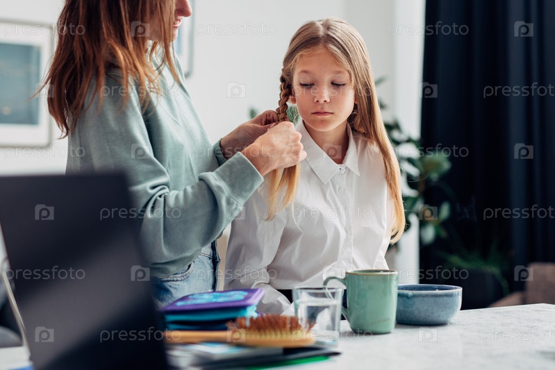 Мать заплетает дочери косички перед школой во время завтрака