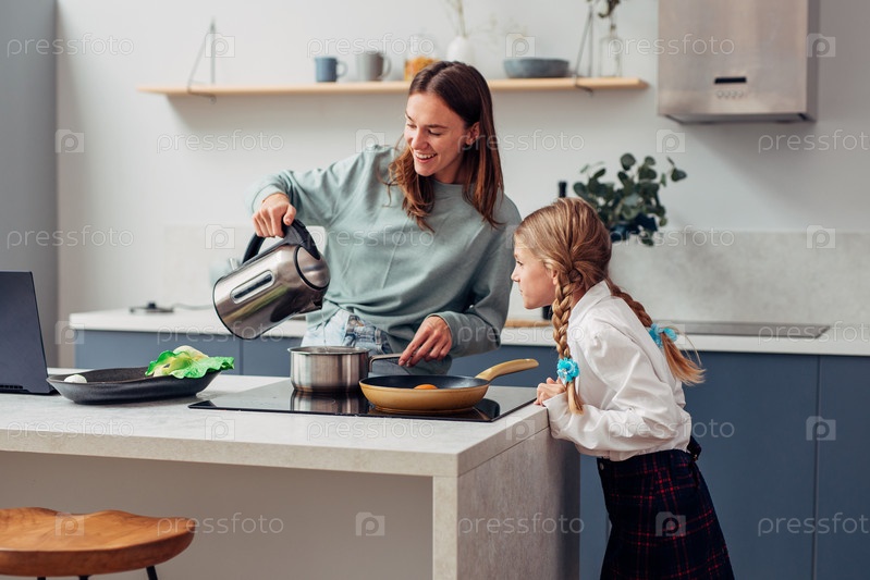 Женщина готовит еду рядом со своей любопытной дочерью-школьницей