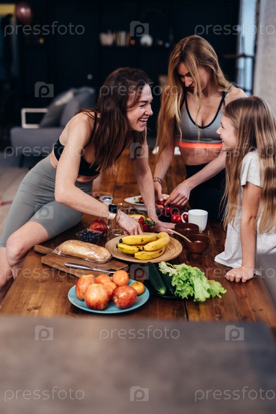 Девушки на кухне разговаривают, готовят легкие блюда из фруктов и овощей