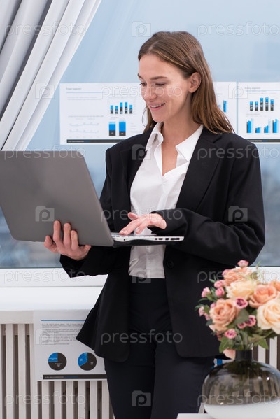 Женщина, стоящая в офисе с ноутбуком