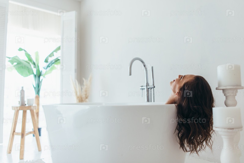 Купающаяся женщина отдыхает в ванне с закрытыми глазами