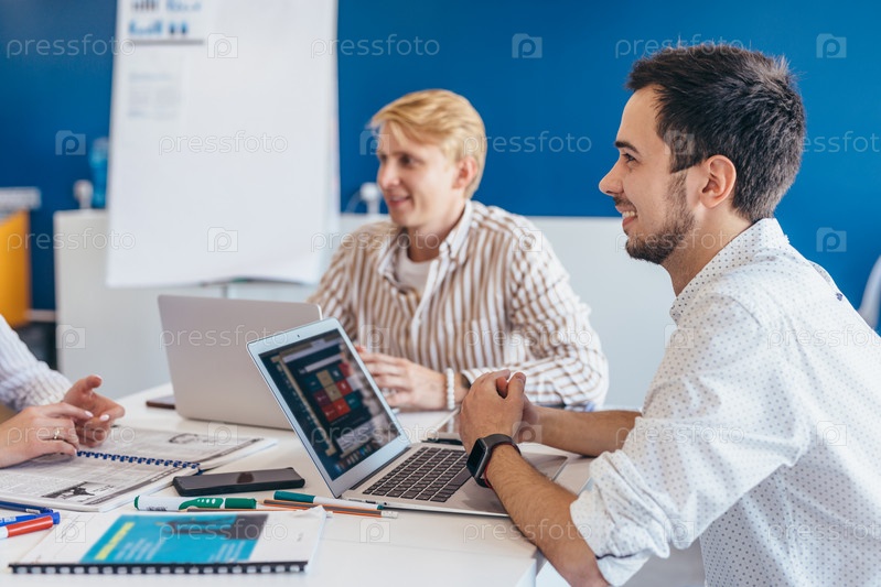 Двое мужчин сидят в офисе за столом с ноутбуком