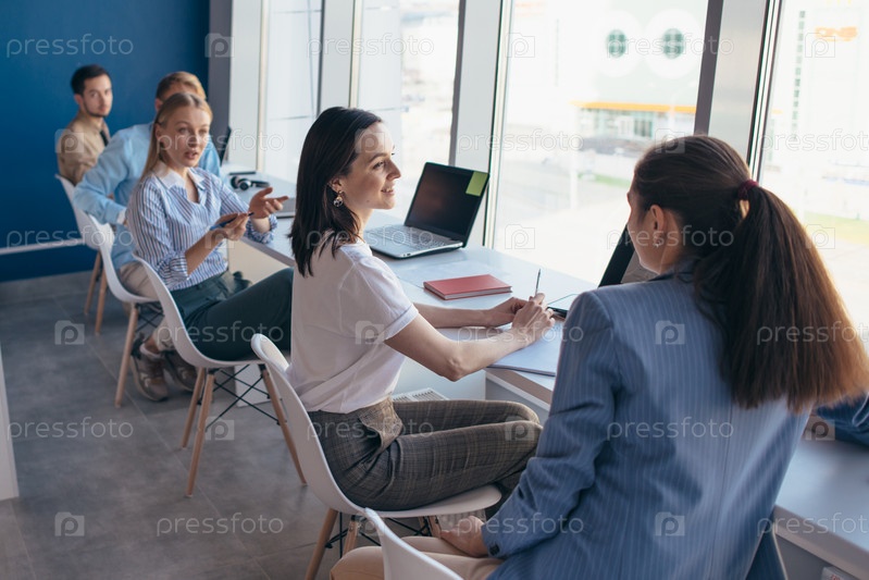 Группа коллег, сидящих подряд за столом в офисе