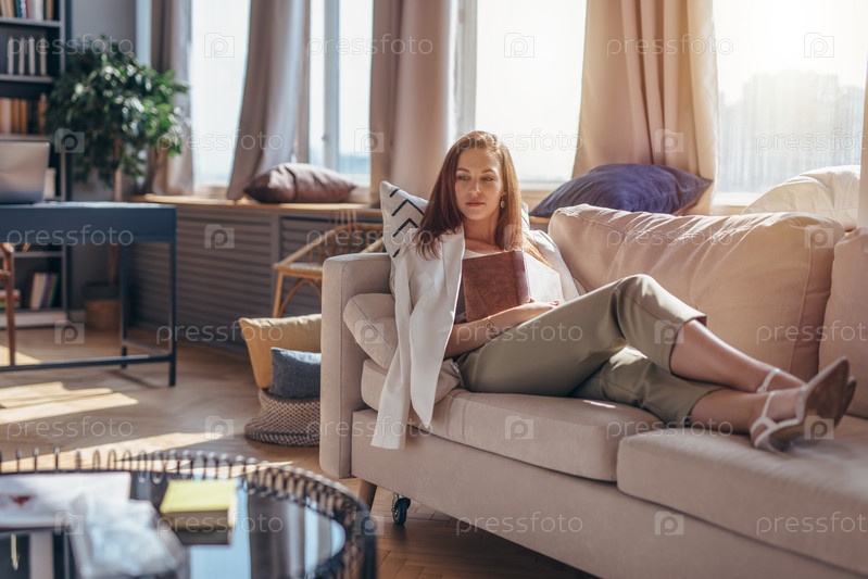 Молодая женщина дома лежит на диване с книгой