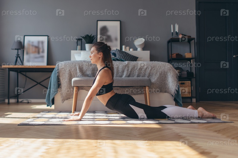 Женщина в позе кобры, она тренируется на полу, ее руки вытянуты, а верхняя часть тела поднята вверх, вытянута назад