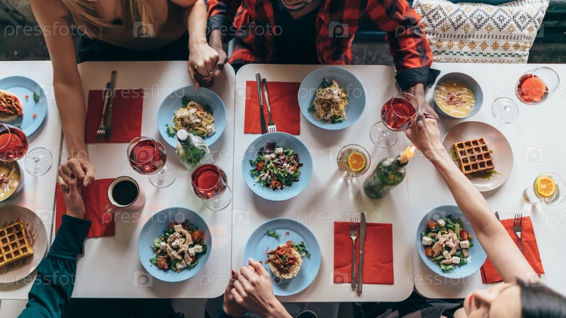 Группа людей молится перед едой дома
