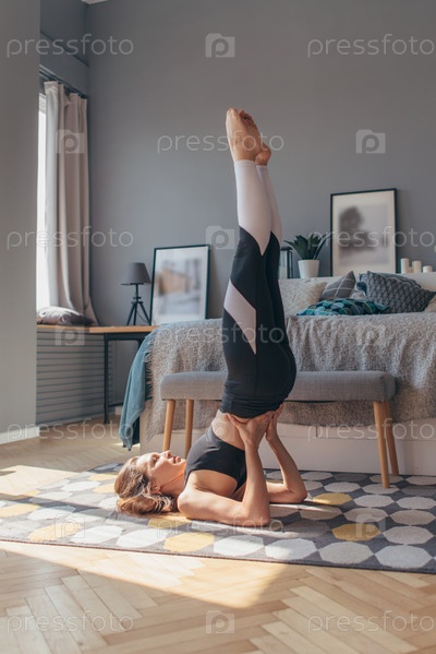 Стойка на лопатках. Подтянутая женщина тренируется дома